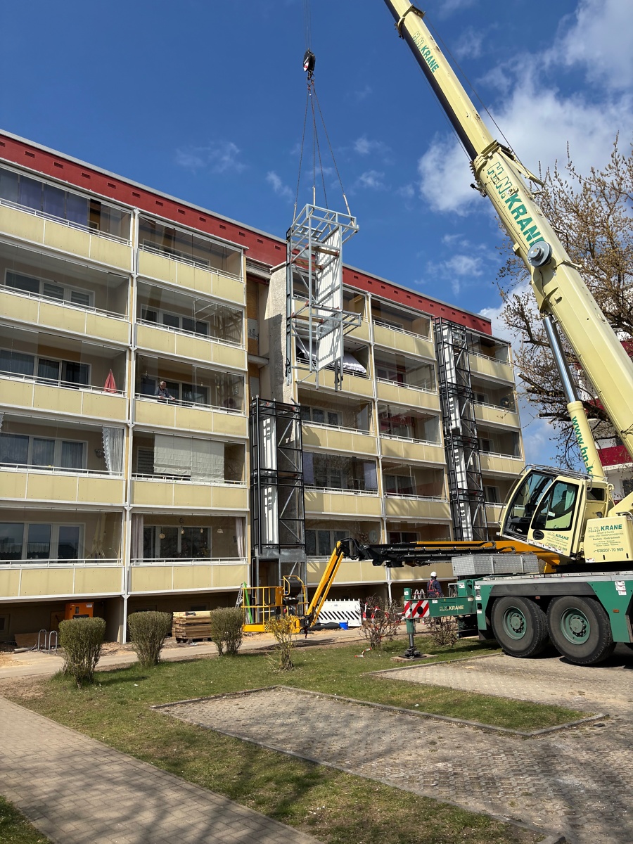 Der Anbau der Aufzüge in der Straße der Jugend 38-44 ist abgeschlossen. Nach 7monatiger Bauzeit halten die 4 Aufzüge auf halber Etage und erleichtern unseren Mietern somit die Erreichbarket der 40 Wohnungen. Mit dieser Maßnahme haben wir erneut unseren Wohnungsbestand aufgewertet und die Wohnqualität für unsere Mieter verbessert und langfristig attraktiven Wohnraum geschaffen.